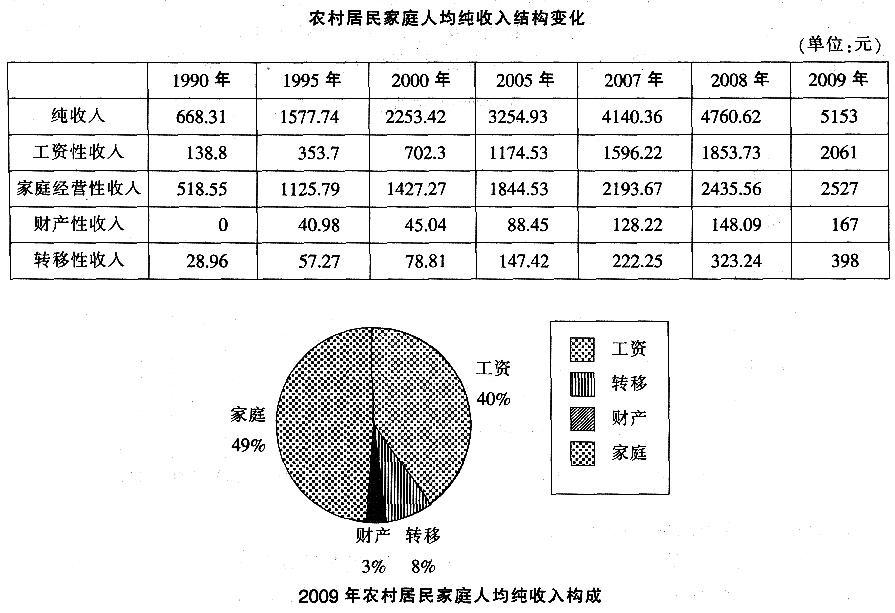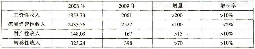 问题 根据以下资料,回答66—70题。 2009年,农村居民家庭人均纯收入构成中,增幅最小的是()。 A.工资性收入 B.家庭经营性收入 C.财产性收入 D.转移性收入