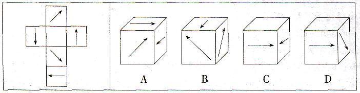 解析 A项上面应为向左箭头;B项正面箭头应向左;C项右侧面箭头应指向对角:D项可由左边图形折成。