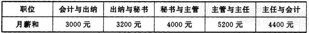 解析 3000+3200+4000+5200+4400=19800,则会计、出纳、秘书、主管、主任月薪之和为9900元。9900—3000—4000=2900即为主任的月薪。