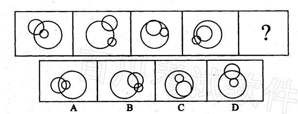 解析 从图中封闭空间的数量来看,从左到右是5、5、4、5,接下来应该是5;从交点数量来看是4、4、3、4,下一个应该是4,封闭空间的数量比交点数量分别多一个,且呈左右对称的关系。