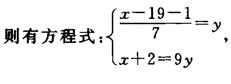 问题 有一批书,分给公司的所有人,每人1本,还差19本,每个部门派7本,多出1本,如果加2个人进公司,正好每个部门有9人,求总共有几个部门?()