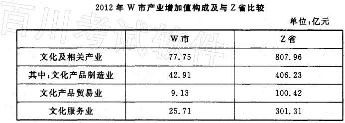 问题 2012年Z省W市实现文化及相关产业增加相比上年增长9.6%,在文化产品制造业中,文化印刷、文化用品制造和工艺美术品制造三大主导行业,2012年分别实现增加值21.82亿元,11. 57亿元和6.62亿元。 与全省结构相比,W市文化产品制造业增加值占文化及相关产业增加值的比重比全省水平()