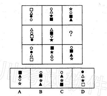 解析 每列三个图形含有的小图形没变,只是相对位置改变。根据第三个小图形的相对位置变化规律,可以直接选C。