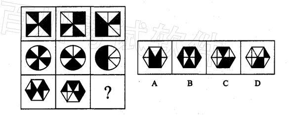解析 本題考查元素叠加。九宫图中,每一行中的前两个图形叠加形成第三个图形,叠加时遵循以下规律:白+白=黑,黑+黑==黑,黑+白=白,白+黑=白。依此规律,问号处应填D项图形。故正确答案为D。