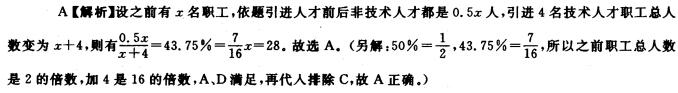 某单位引进4名技术型人才之后,非技术型人才在职工中的比重从50%下降至43.75%,问该单位在引进人才之前有多少名职工?()A.28名B.32名C...
