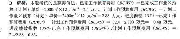 问题 某施工企业进行土方开挖工程,按合同约定3月份的计划工程量为2400M3,计划单价是12 元/M3;到月底检查时,确认承包商实际完成的工程量为2000M3,实际单价为15 元/M3。则该工程的进度偏差(SV)和进度绩效指数(SP/)分别为( )。