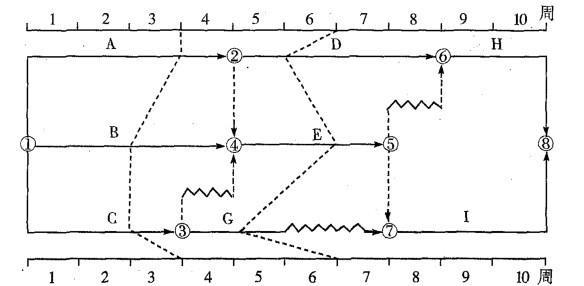 解析 本题关键线路有3条分别为:①—②—⑥—⑧, 1-2-4-5-7-8,1-4-5-7-8,第三周时检查B拖后一周,位于关键线路上,所以预计工期拖后1周,A正确;第六周检查D拖后一周所以C正确,..............AC