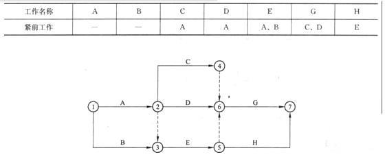 解析 2018版教材P123 4、逻辑关系 网络图中工作之间的相互制约或相互依赖的关系称为逻辑关系,它包括工艺关系和组织关系,在网络中均应表现为工作之间的先后顺序。表格中给G工作的紧前工作为C和D两项工作,即做完C和D工作后就开始做G工作,而网络图中给出的是做完C、D和E三项工作后,才开始G工作,与表格中的逻辑关系不符,。