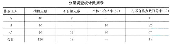 解析 2018版教材P196 通过分层调查表,可以明显看出是作业工人C影响了总体质量水平。所以选C。D选项原为“作业工人D”,现更改为“以上均不正确”,因为图中并没有涉及到工作D