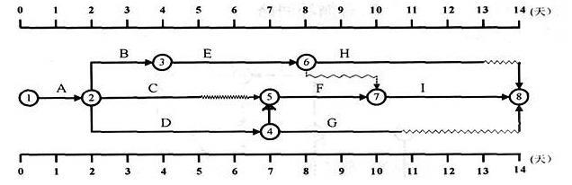 某工程双代号时标网络计划如下图所示(单位:周),其中工作E的总时差和自由时差( )周 A、均为0 B、分别为1和0 C、分别为2和0 D...