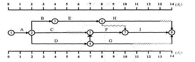 解析 2018版教材P140 先找关键线路1-2-4-5-7-8,就知道关键工作A,D,F,I,还有总工期14。A错误,B正确。D工作在关键线路上,自由时差为0,E工作自由时差看波浪线,取最小1天,C工作波浪线为2天。CD错误,E正确。