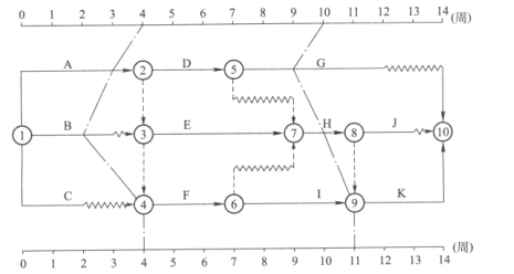 下图所示的某工程双代号时标网络计划,在执行到第4周末和第10周末时,检查其实际进度如图中前锋线所示,检查结果表明( )。 A、第4周末检查时,工作B拖...