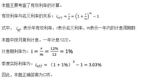 已知年利率12%,每月复利计息一次,则季实际利率为( )A. 1.003%B. 3.00%C. 3.03%D. 4.00%