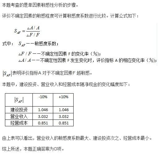 某项目采用净现金指标进行敏感性分析,有关数据见下表。则各因素的敏感程度由大到小的顺序是( )。A. 建设投资—营业收入—经营成本B. 营业收入—...