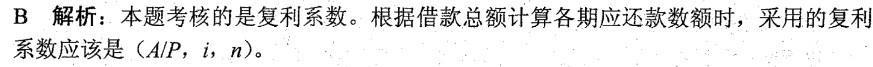 问题 某施工企业一次性从银行借入一笔资金,按复利计息,在随后的若干年内采用等额本息 偿还方式还款,则根据借款总额计算各期应还款数额时,采用的复利系数是( )。 A. (P/A,i,n) B. (A/P,i,n) C. ( F/A,i,n) D. (