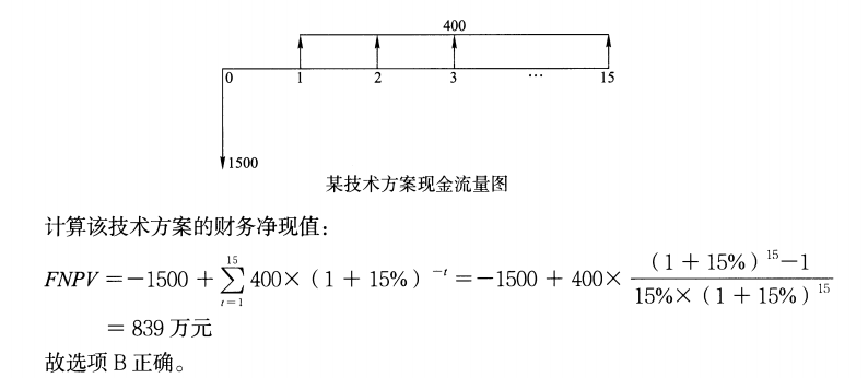 问题 某技术方案的初期投资额为1500 万元,此后每年年末的净现金流量为400 万元,若基准收益率为15%,方案的寿命期为15 年,则该技术方案的财务净现值为(  )万元。