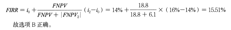 问题 某项目的基准收益率i0 = 14%,净现值FNPV = 18.8 万元。现为了计算其内部收益率,分别用i1 = 13%、i2 = 16%、i3 = 17% 进行试算,得出FNPV1 = 33.2 万元、FNPV2 =-6.1 万元、FNPV3 =-10.8 万元。则采用内插法求得的最接近精确解的内部收益率为(  )。