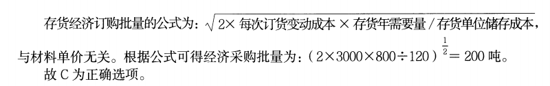 问题 企业生产所需的某种材料年度采购总量为800 吨,材料单价为4500 元/ 吨,一次订货成本为3000 元,每吨材料的年平均储备成本为120 元。则该材料的经济采购批量为(  )吨。