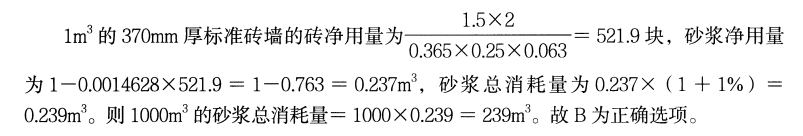 问题 砌1000m3 的370mm 厚标准砖墙的砂浆总消耗量为(  )m3。(标准砖尺寸为240mm*115mm*53mm,灰缝10mm;标准砖和砂浆的损耗率均为1%)
