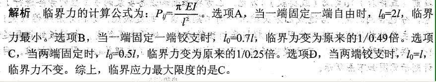 受压杆件在下列支承情况下,若其他条件相同临临界应力最大的是()。A. 一端固定一端自由 B. —端固定一端铰支 , C.两端固定 D.两端铰支c