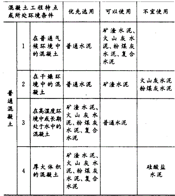 解析 在混凝土工程中,根据使用场合、条件的不同,可选择不同种类的水泥,普通混凝选用水泥可参考下表。