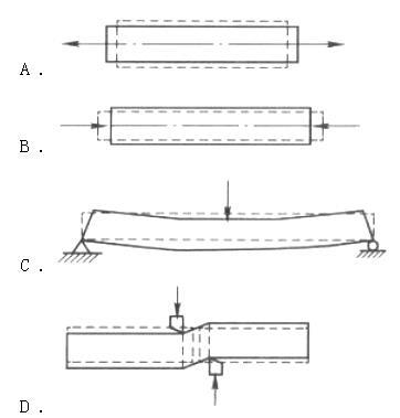 解析 2017版教材P2页 考点:杆件的受力形式。结构杆件的基本受力形式按其变形特点可归纳为以下五种:拉伸、压缩、弯曲、剪切 和扭转,A拉伸、B压缩、C弯曲、D剪切。
