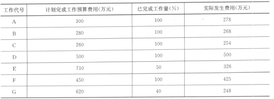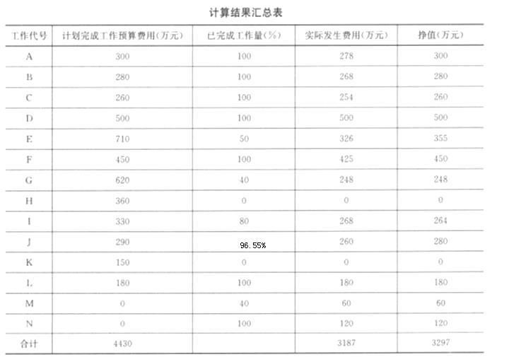 解析 (1)挣值法的三个参数(费用值)为: 1)BCWS:计划完成工程预算费用,是根据预算安排,在某一时刻应当完成的工作(或部分工作),以预算为标准所需的资金总额。 2)BCWP:已完成工作预算费用,是指某一时间已经完成的工作(或部分工作),以批准认可的预算为标准所需的资金总额。 3)ACWP:已完成工作实际费用,是指到某一时刻为止,已完成的工作(或部分工作)所实际花费的总金额。 (2)计算结果如下表所示: (3)14周末累计的计划完成工作预算费用BCWS为4430万元,已完成工作实际费用ACWP为3187万元。 (4)14周末的CV与SV 1)费用偏差:CV=BCWP-ACWP=3297-3187=110万元,由于CV为正,说明费用节支。 2)进度偏差:SV=BCWP-BCWS=3297-4430=-1133万元,由于SV为负,说明进度拖后。 (5)14周末的CPI与SPI 1)费用绩效指数:CPI=BCWP/ACWP=3297/3187=1.035,由于CPI>1,说明费用节支。 2)进度绩效指数:SPI=BCWP/BCWS=3297/4430=0.744万元,由于SPI<1,说明进度拖后。 原题J工作的实际完成工作量是100%,但是它的计算过程结果有误,所以进行了修正