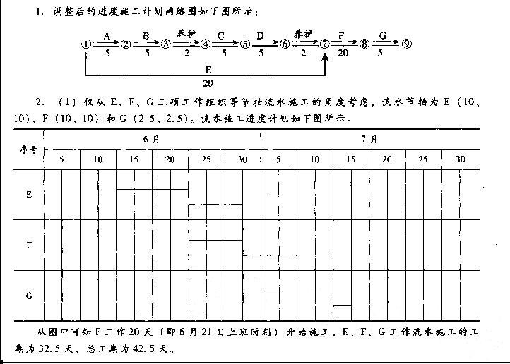 解析 (2)从网络计划的整体角度,考虑事件一、亊件二影响,F工作27天(即6月28 B上班 时刻)才能开始施工。则总工期=42.5 +7 =49.5天。满足原合同约定的工期。 3. (1)钢筋制作的劳动力投入量=2 700/ (15 x4.5) =40 (人)。 (2)应考虑的参数:工程量;持续时间;劳动力投入量;劳动效率;班次;每班工作时间。 4.专业分包:防水施工工程。劳务分包:砌筑作业,钢筋作业,混凝土作业。