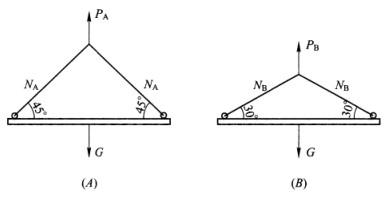 吊一重物,斜索夹角不同,如图所示,假设斜索中拉力为N,总吊索拉力为P,则()。A:PA>PBNA>NBB:PA=PBNA<NBC:PA=PBN...