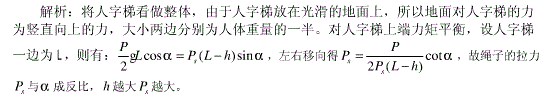 .图示人字梯放置在光滑(忽略摩擦)地面上,顶端人体重量为P。关于绳子拉力与梯子和地面的夹角a、绳子位置h的关系的说法,正确的是( )。A.a、h越大,...