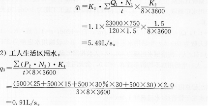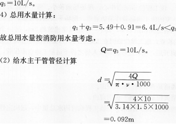 解析 (1)工程总用水量计算 1)首先计算现场施工用水量: 3)设定消防用水量: 因为该区域工地面积远小于5hm2,故按最小消防用水量选用: 按水管管径规定系列选用,最靠近92mm的规格是100mm,故本工程临时给水干管选用φ100管径。