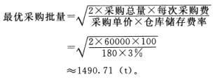 解析 【答案要点】 1.采购费与仓储费之和=每次采购量/2*采购单价*仓库储存费率+总采购量/每次采购量*每次采购费。将两种方案费用代入上述公式:方案一:5000/2*220*3%+60000/5000*100=17700(元);方案二:10000/2*200*3%+60000/10000*120=30720(元)。若以采购费与仓储费之和为标准判断,则应采用方案一。 2.方案一:材料原价=60000*220=13200000(元);方案二:材料原价=60000*200=12000000(元)。面对材料原价的巨大差距,采购费与仓储费之和的差距不值一提,应采用方案二。 3.当在使用中对水泥质量有怀疑或水泥出厂超过3个月(快硬硅酸盐水泥超过1个月)时,应进行复验,并按复验结果使用。 4.