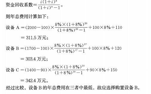 解析 设备采购方案比选的直接依据就是各方案设备年总费用值:年总费用=施工机械设备的年折旧费+年使用费+年安装费。年折旧费=年分配采购费- 年分配残值=(总采购费-总残值)*资金回收系数+总残值*利率。
