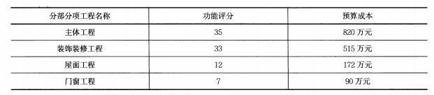 解析 价值系数=功能系数/ 成本系数。本题只需找出成本比重偏高的分部分项工程(即价值系数最低的项),并不需要精确计算,可用“功能评分/ 预算成本”进行估算。主体工程估算结果0.043、装饰装修工程估算结果0.064、屋面工程估算结果0.070、门窗工程估算结果0.078,由此可见,相对于单位功能评分值主体工程的成本过高。
