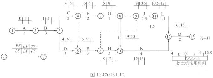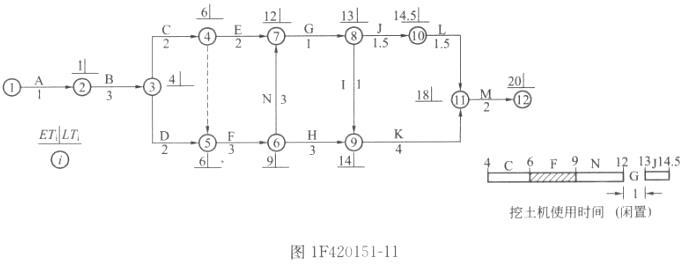 问题 某水利水电工程项目的原施工进度网络计划(双代号)如图1F420151-6所示。该工程总工期为18个月。在上述网络计划中,工作C、F、J三项工作均为土方工程,土方工程量分别为7000m3、10000m3、6000m3,共计23000m3,土方单价为15元/m3。合同中规定,土方工程量增加超出原估算工程量25%时,新的土方单价可从原来的15元/m3下降到13元/m3。合同约定机械每台闲置1天为800元,每月以30天计;C、F、J实际工作量与计划工作量相同。 施工中发生如下事件: 事件1:施工中,由于施工单位施工设备调度原因,C、F、J工作需使用同一台挖土机先后施工。 事件2:在工程按计划进行4个月后(已完成