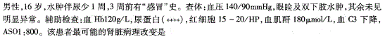 解析 B ①患者发病前3周有上感前驱症状,补体C3下降,血清抗链球菌溶血素ASO升高,提示有链球菌感染史。患者有血尿、蛋白尿、水肿,可诊断为急性肾小球肾炎,病理类型为毛细血管内增生性肾小球肾炎,表现为弥漫性肾小球病变,以内皮细胞和系膜细胞增生为主。②肾病综合征主要表现为大量蛋白尿、血浆蛋白降低、水肿、血脂升高等,一般不会出现血尿,与本例不符(本例尿红细胞15~20/HP)o系膜增生性肾小球肾炎、新月体性肾小球肾炎和局灶节段性肾小球肾炎都属于肾病综合征的常见原因。