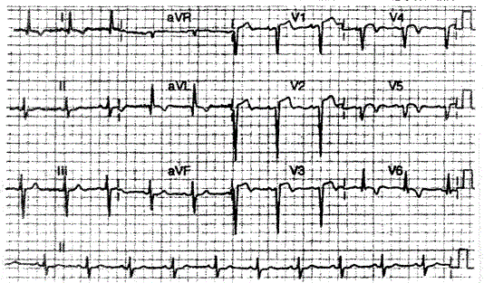 女性,74岁,1周前因股骨颈骨折卧床行保守牵引治疗。8小时前在睡眠中突发心前区疼痛,持续伴阵发加重,出汗,口含硝酸甘油不缓解。既往有高血压、糖尿病病史。人...