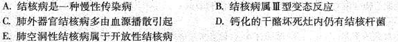 解析 B肺结核是一种常见的慢性传染病。其主要传染源是开放空洞性肺结核患者。结核病的特征性 病变为干酪样坏死,可发生钙化,钙化的干酪坏死灶内仍可有结核杆菌存活,可成为复发的根源。结核病 属于IV型变态反应(B错)。肺结核可经血行播散到肺外器官,如90%的肠结核来源于肺结核。参阅 【1998N060】。