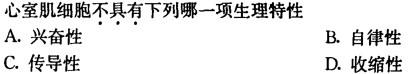解析 B [考点]心室肌的生理特性 [分析]心室肌细胞是工作细胞,与特殊传导系统的心肌细胞不同。心室肌细胞有兴 奋性(兴奋后有效不应期长)、传导性和收缩性,没有自律性;而特殊传导系统的心肌细胞有兴奋性、传导性和自律性,没有收缩性。