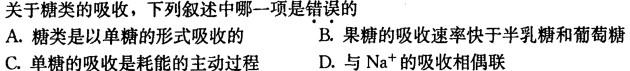 解析 B [考点]营养物质的吸收 [分析]糖类只有分解为单糖才能被小肠上皮细胞所吸收。各种单糖的吸收速率有很大的差别,己糖的吸收很快,戊糖则很 慢。在己糖中,半乳糖和葡萄糖的吸收最快,果糖次之,甘露糖最慢。单糖的吸收是耗能的主动过程,它可逆浓度差进行,能量来自钠泵,属继发性主动转运。