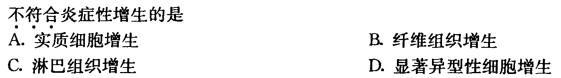 解析 D [考点]炎症 [分析]炎症性增生包括实质细胞增生、 纤维组织增生、淋巴组织增生、单核巨噬细胞增生和血管增生。上述增生一般无显著异 型性,在形态学上,炎症增生的异型性即使有,也是轻微的。