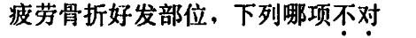 解析 BCD [考点]疲劳骨折 [分析]疲劳骨折好发于第2跖骨干和 肋骨。第3、4跖骨,腓骨远侧,胫骨近侧和 股骨远侧也可发生。不发生在第1跖骨干。