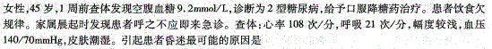解析 患者为2型糖尿病,口服降糖药治疗,突发昏迷,可能为低血糖症。患者心率加快,呼吸浅快,皮肤潮湿,收缩压轻度升高等,都是低血糖发作时交感神经过度兴奋的表现。酮症酸中毒和乳酸酸中毒都可合并严重酸中毒,常表现为呼吸深快、皮肤干燥、血压降低等,与本例不符。非酮症高渗昏迷起病缓慢, 就诊时常有严重脱水、休克,血糖圣33.3mmol/L,都与与本例不符。