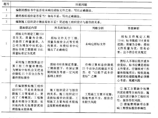 问题 某城市快速路工程项目招标,工程长1. 8km,主路宽40m,两侧辅路各宽10m;其 中约1km路段现况为农田。招标文件规定工期150日历天,质量为合格,并提供工程量清单。A公司为增加中标机会,投标书将工期提前10d,质量标准定为优质。采用施工图 预算法计算各分部分项工程工作量和费用后,为增加中标机会又把总价降低25个百分点 作为最终投标报价。在编制投标施工组织设计时,为节省时间,在类似道路施工方案基础 上,更改了工程概况、工程数量表和部分方案图,但农田地内有关池塘淤泥处理措施未能 体现。