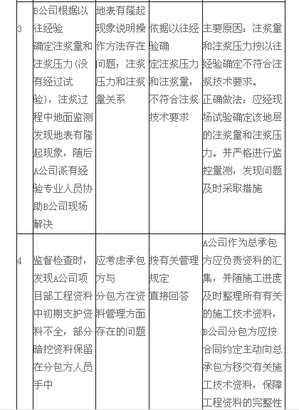 问题 某供热管线暗挖隧道工程,长2.8km,断面尺寸3.8m*3.Om,埋深6m。隧道穿越砂土层和部分砂砾层,除局部有浅层滞水,无须工程降水。承包方A公司通过招标将5#~6#井段穿越砂砾层地层长318m的隧道开挖及初次支护分包给B专业公司。 B公司依据A公司的施工组织设计,进场后由工长向现场作业人员交代了施工做法和要求,随后开始隧道暗挖支护的施工。 施工中B公司在掘进到76m时,发现开挖面砂砾层有渗水且土质松散,有塌方隐患。B公司立即向A公司汇报。经与设计、监理现场商定,决定采用在上台阶开挖面补打注浆管注浆加固地层措施。B公司采用劈裂注浆法,根据以往经验确定注浆量和注浆压力,注浆过程中地面监测发现地表有隆起现象。随后A公司派有经验的专业人员协助B公司现场解决技术问题。 质量监督部门在施工过程监督检查时,发现
