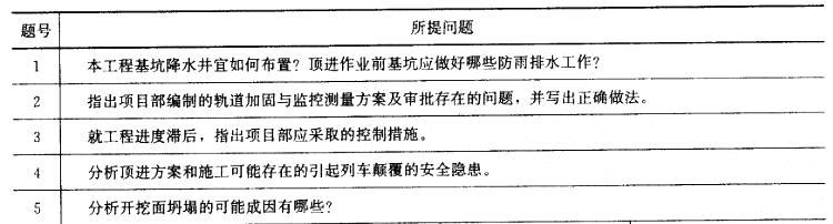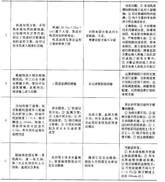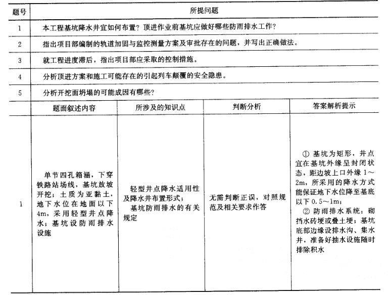 问题 背景 某市主干道下穿铁路站场线采用顶进箱涵施工,箱涵设计:单节箱涵四孔道,总宽32m,高5m,总长度38. 5m,为现浇钢筋混凝土结构,箱涵前端设斜面钢刃角。箱涵预制工作坑土质为亚黏土、地下水位于地面以下4m,基坑采用放坡明挖和轻型井点降水,并设置了防雨排水设施,计划6月10日雨期开始前实现顶进就位。 项目部编制轨道加固方案,采用轨束梁加固铁路线路,以保障列车按正常速度行驶;制定了顶进时对箱涵结构的监控方案,经项目部技术负责人批准后实施。 开工后,由于降水措施不利,工作坑开挖进度缓慢,进度计划滞后。预制箱涵达到设计强度并完成顶进后背的制作时,顶进施工进入雨期。为加快施工进度,项目部采用轮式装载机直接开入箱涵孔内铲挖土体,控制开挖面坡度为1 : 0.6,钢刃脚进土 50mm,根据土质条件每次开挖进尺0. 5m,并在列车运营时连续顶进。 箱涵顶进接近第一条线路时,夜间遇一场大雨,第二天正在顶进时,开挖面土方坍塌,造成安全事故。 问题
