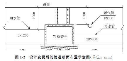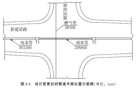 问题 某公司承建的市政道路工程,长2km,与现况道路正交,合同工期为2015年6月1日至8月31日,道路路面底层某基层设计为厚300mm水泥稳定土;道路下方设计有一条DN1200mm钢筋混凝土雨水管道,该管道在道路交叉口处与现状道路下的现有DN300mm燃气管道正交。 施工前,项目部踏勘现场时,发现雨水管道上部外侧管壁与现况燃气管道底间距小于规范要求。并向建设单位提出变更设计的建议。经设计单位证实,同意将道路交叉口处的Y1~Y2井段的雨水管道变更为双排DN8000mm双壁波纹管,设计变更后的管道平面位置与断面布置如图1-1,1-2所示。项目部街道变更后提出了索赔申请,经计算,工程变更需增加造价10万元。 图1-1 设计变更后的管道平面位置示意图(单位:mm) 为减少管道施工对交通通行的影响,项目部制定了交叉路口交通导行方案,并获得交通管理部门和路政管理部门的批准。交通导行措施的内容包括: (1)严格控制临时占路时间和范围; (2)在施工区域范围内规划了警告区、终止区等交通疏导作业区域; (3)与施工作业队伍签订《施工安全责任合同》。 施工期间为雨季项目部针对水泥稳定土底基层的施工制定了雨期施工质量控制措施如下: (1)加强与气象站联系,掌握天气预报安排在不下雨时施工; (2)注意天气变化,防止水泥和混合料遭雨淋; (3)做好防雨准备,在料场和搅拌站搭雨棚; (4)降雨时应停止施工,对已摊铺的混合料尽快碾压密实。 <1> 、排水管道在燃气管道下方时其最小垂直距离应为多少米? <2> 、按索赔事件的性质分类,项目部提出的索赔属于哪种类型?项目部应提供哪些索赔资料? <3> 、交通数到方案(2)中还应规划设置哪些交通疏导作业区域? <4> 、交通疏导方案中还应补充哪些措施? <5> 、补充和完善水泥稳定土底基层雨期施工质量控制措施。