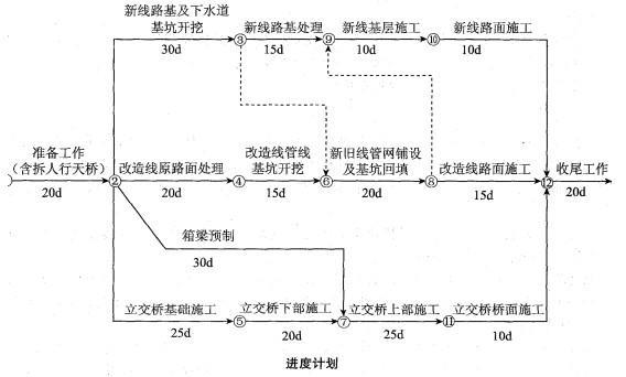 问题 【背景资料】 某公司承接了某城市道路的改扩建工程。工程中包含一段长240m的新增路线(含下水道200m)和一段长220m的路面改造(含下水道200m),另需拆除一座旧人行天桥,新建一座立交桥。工程位于城市繁华地带,建筑物多,地下管网密集,交通量大。 新增线路部分地下水位位于-4.00m处(原地面高程为0.000),下水道基坑底设计高程为一5. 50m,立交桥上部结构为预应力箱梁,釆用预制吊装施工。 项目部组织有关人员编写了施工组织设计(其中进度计划如下图所示),并绘制了一张总平 面布置图,要求工程从开工到完工严格按该图进行平面布置。 新线路基及下水道 基坑开挖 新线路基处理_新线基层施工_新线路面施工 施工中,发生了如下导致施工暂停的事件。 事件1 :在新增路线管网基坑开挖施工中,原有地下管网资料标注的城市主供水管和光电缆位于-3.Om处,但由于标识的高程和平面位置的偏差,导致供水管和光电缆被挖断,使开挖施工暂停14d。 事件2 :在改造路面施工中,由于摊铺机设备故障,导致施工中断7d。 项目部针对施工中发生的情况,积极收集进度资料,并向上级公司提交了月度进度报告,报告中综合描述了进度执行情况。 问题: 1.本项目中超过一定规模的危险性较大的工程有哪些? 2.背景中关于施工平面布置图的使用是否正确?说明理由。 3.计算工程总工期,并指出关键线路(指出节点顺序即可)。 4.分析施工中先后发生的两次事件对工期产生的影响。如果项目部提出工期索赔,应获得几天延期?说明理由。 5.补充项目部向企业提供月度施工进度报告的内容。