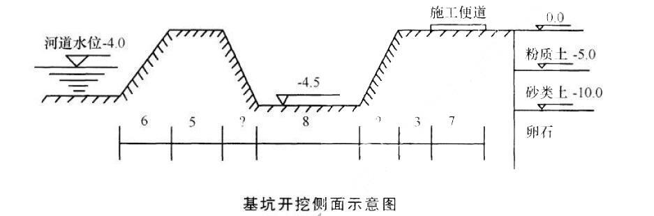 背景资料:A 公司承建一座桥梁工程,将跨河桥的桥台土方开挖分包给B 公司。桥台基坑底尺寸为50*8m,深4.5m;施工期河道水位为-4.0m。基坑...