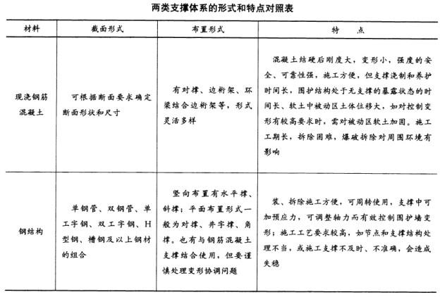解析 考点应为软弱土层基坑支撑结构知识。具体内容包括:(1)内支撑有钢撑、钢管撑、钢筋混凝土撑、钢与混凝土的混合支撑等;外拉锚有拉锚和土锚两种形式。(2)在软弱地层的基坑工程中,支撑结构承受围护墙所传递的土压力、水压力。支撑结构挡土的应力传递路径是围护(桩)墙→围檩(冠梁)→支撑;在地质条件较好的有锚固力的地层中,基坑支撑可采用土锚和拉锚等外拉锚形式。(3)在深基坑的施工支护结构中,常用的支撑系统按其材料可分为现浇钢筋混凝土和钢结构支撑形式,两类形式和特点对照见下表。 现浇钢筋混凝土支撑体系由围檩(圈梁)、支撑及角撑、立柱和围檩托架或吊筋、立柱、托架锚固件等其他附属构件组成。钢结构支撑(钢管、型钢支撑)体系通常为装配式的,由围檩、角撑、支撑、预应力设备(包括千斤顶自动调压或人工调压装置)、轴力传感器、支撑体系监测监控装置、立柱桩及其他附属装配式构件组成。